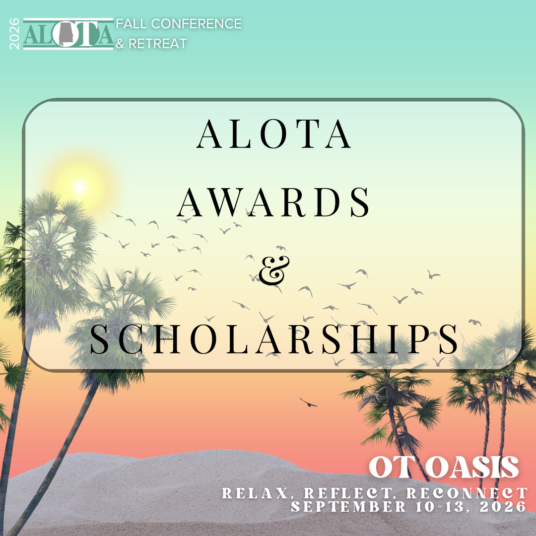 Each year, the Alabama Occupational Therapy Association (ALOTA) honors the outstanding work and service of occupational therapy practitioners and students across the state. These awards are presented at our annual ALOTA Fall Conference & Retreat, providing an exciting opportunity to recognize your peers, mentors, and future leaders.