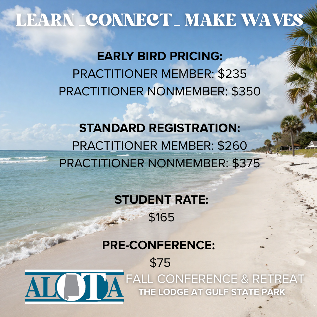 Join us for an unforgettable weekend of learning, connection, and rejuvenation at the 2026 ALOTA Fall Conference & Retreat. Set against the beautiful backdrop of Alabama’s Gulf Coast, this special event brings together occupational therapy professionals from across the state and beyond for meaningful professional development, collaboration, and networking.