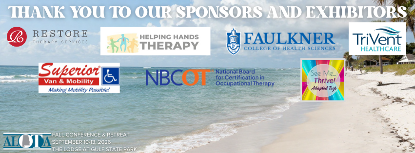 Becoming a sponsor at the 2026 ALOTA Fall Conference & Retreat is a unique opportunity to showcase your brand, connect with occupational therapy professionals, and support the continued advancement of healthcare in Alabama. Whether you're a healthcare provider, educational institution, product vendor, or organization aligned with wellness and rehabilitation—your presence matters.